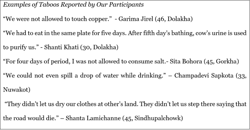 The journey into the Underworld does not only mean being initiated to the unknown psyche, which is the unconscious, but also it means that the one who takes the journey will come back with the energy or the knowledge of the dead. I believe that it is possible that a woman who bleeds also is someone who pays a visit to the Underworld, the land of the dead. Thus, I think, this might be one of the underlying reasons of the origin of this taboo and why it was (and in some cultures it still is) forbidden for a bleeding woman to touch the soil, to enter religious places, to cook or clean, to touch his husband and children, and to participate in some common rituals, etc. A survey shows clearly the still ongoing menstrual taboo within cultures: